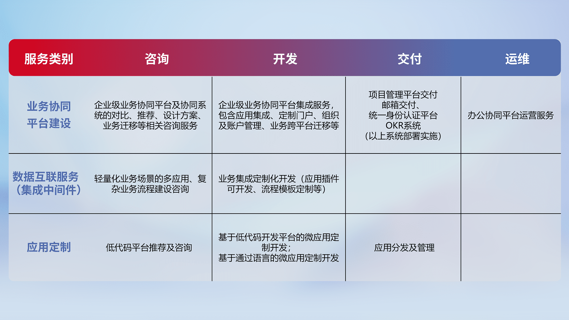 针对钉钉、、、、企微、、IDaas等平台级产品提供产品的规划、、、、方案、、交付、、、定制化开发等服务,,,实现如统一协同办公、、、智能客户服务、、、混合会议管理、、智能数据查询、、等业务场景,,实现数字化转型。。