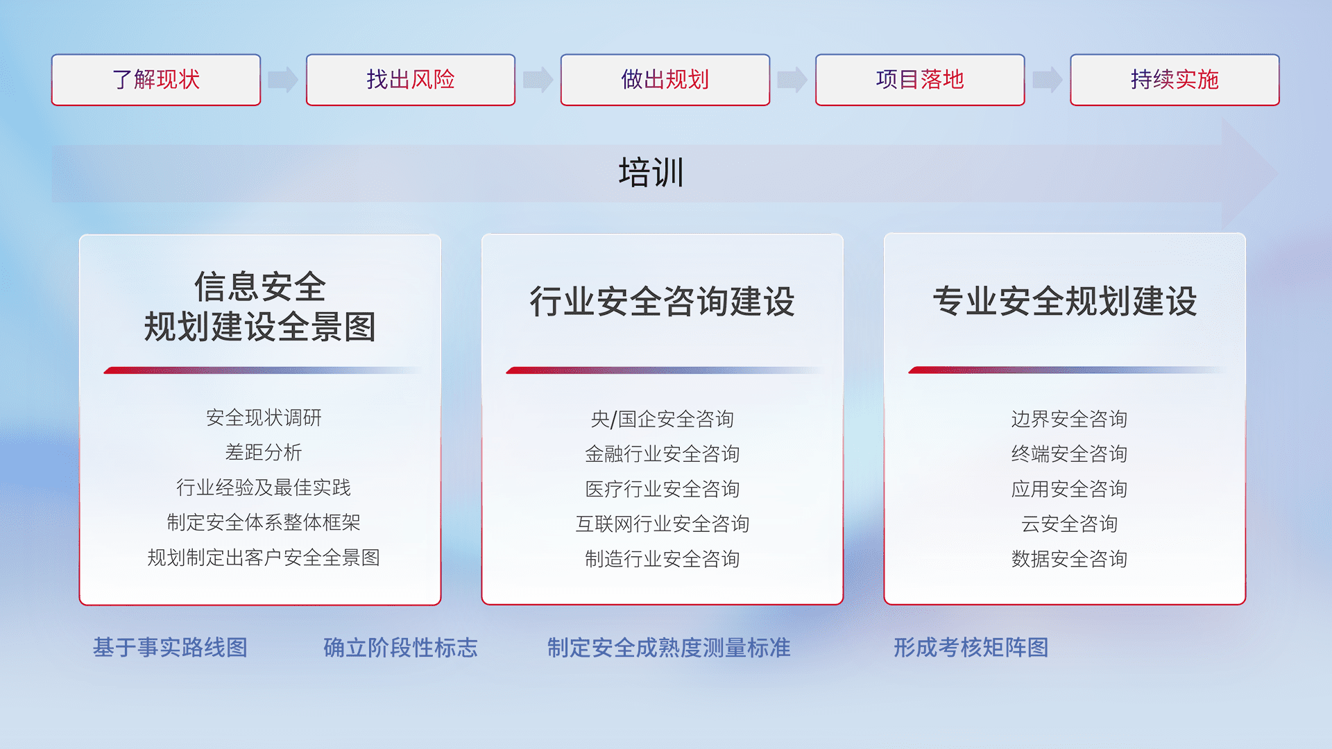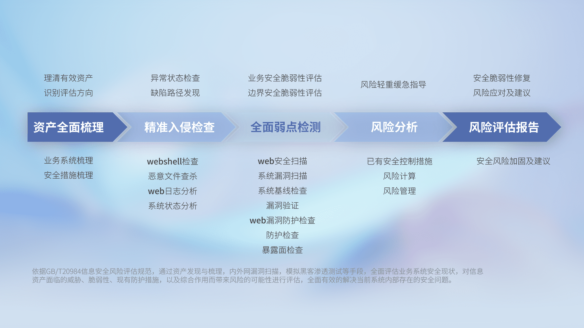 针对客户行业特性,,,,以专业的安全服务+多厂商联合解决方案提供专属的一站式安全管理服务,,,帮助客户全面感知网络空间威胁,,,,基于识别、、、检测、、、分析、、防护、、、、监测、、响应的服务理论模型,,从方案咨询、、、、集成交付、、评估验证、、优化加固、、、、运维运营,,,致力于为客户提供完整的闭环管理式安全服务。。以实战经验为客户打造高抵御风险的安全体系,,帮助客户发现威胁、、、、对抗威胁、、处置威胁,,不断积累安全对抗能力,,持续保障数字化安全。。。